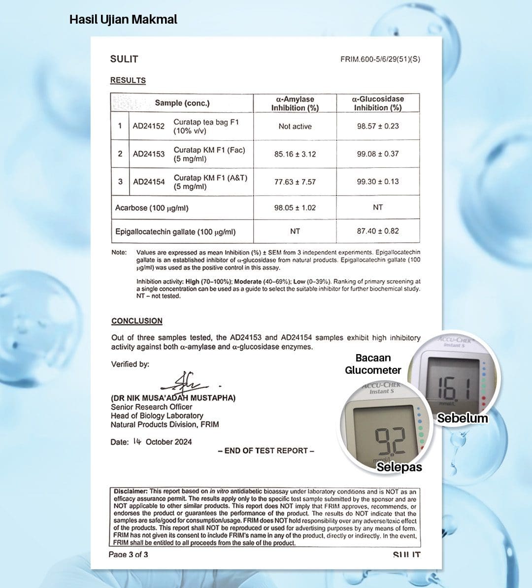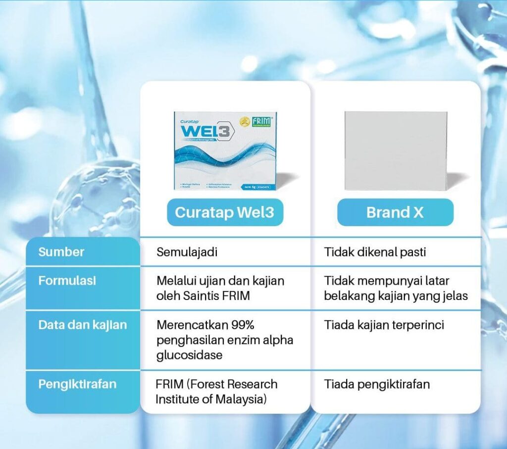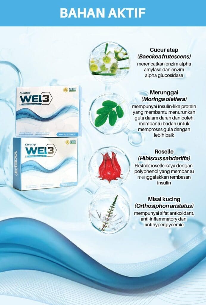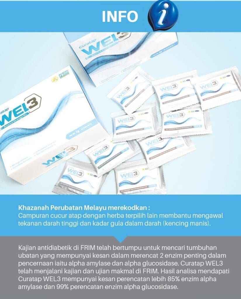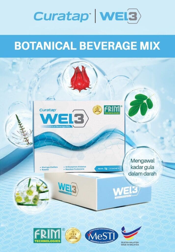 “Curatap WEL3 telah menjalani ujian makmal dan terbukti memberi kesan yang sangat tinggi dalam merencat dua enzim yang terlibat dalam pengawalan aras gula dalam darah selepas makan iaitu alpha-amylase dan alpha glucosidase.”
